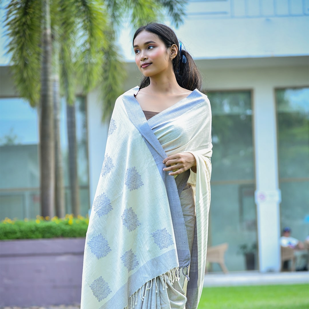Understated elegance meets mindful luxury in this Ivory White Eri Silk Saree, adorned with fine grey woven motifs and soft tassels. This serene piece captures the poetry of minimalism, designed for the woman who appreciates purity in form and fabric.