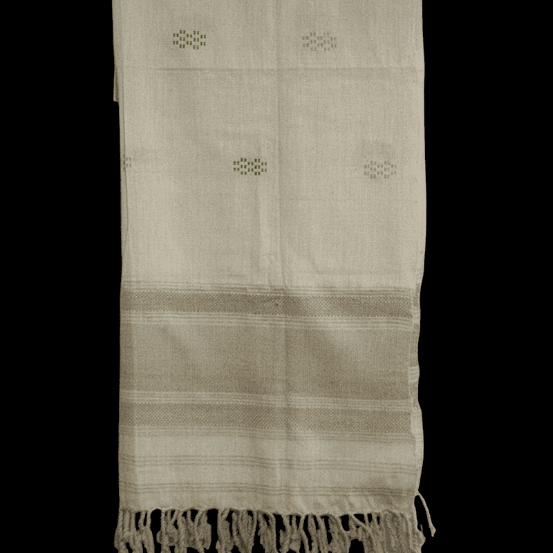 The Meadow Dots stole is a serene blend of tradition and modern minimalism. Handwoven from pure Eri silk, known as “peace silk” for its ethical production, this stole features a natural ivory base scattered with delicate dotted motifs in refreshing green, calming grey, and soft sky blue. Its broad beige woven border and hand-knotted fringes anchor the design in classic elegance. Lightweight yet substantial, this piece offers a breathable drape and timeless versatility—an understated statement of refined luxury rooted in artisan heritage.