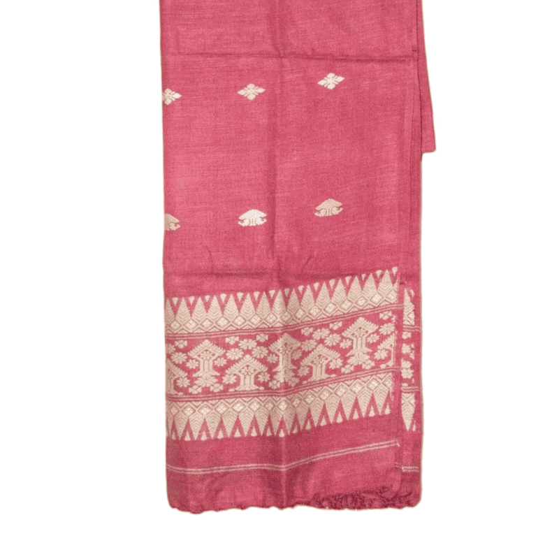 Wrap yourself in the rich, captivating elegance of The Berry Blossom Stole, a handwoven piece that celebrates the artistry of traditional handloom weaving. Crafted from soft handloom Eri silk, this stole offers a smooth, luxurious feel and graceful drape. Its vibrant berry-pink body is adorned with subtle, scattered floral motifs, leading to a wide, intricately woven border featuring a complex pattern of stylized flowers and geometric shapes in natural white. The striking contrast of color and design brings a touch of bohemian sophistication to any outfit, making it a versatile statement accessory that honors natural fibers and artisanal craftsmanship. This stole embodies the conscious luxury that defines Filbrelust.