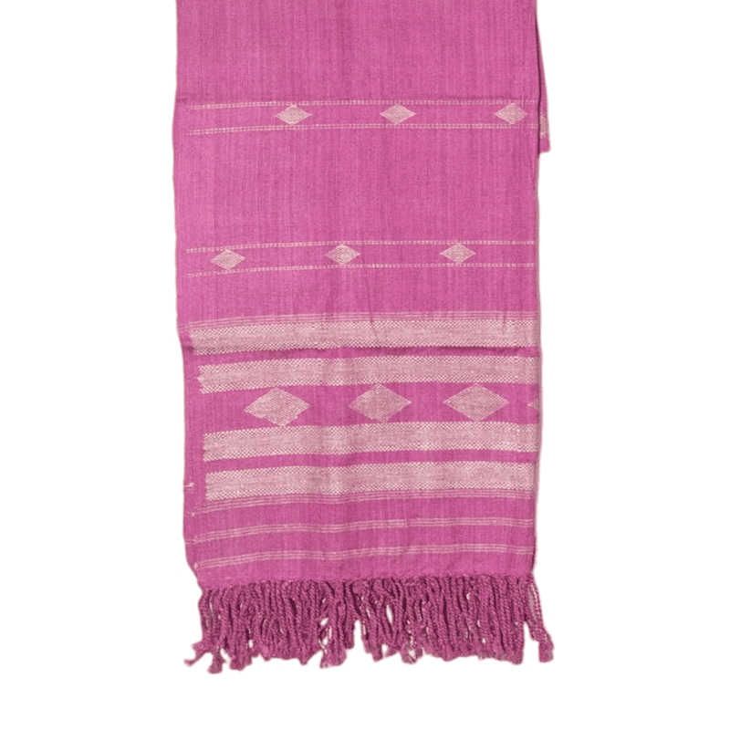 Drape yourself in the vibrant, romantic elegance of The Diamond Rose Stole, a handwoven piece that showcases the artistry of traditional handloom weaving. Crafted from soft handloom Eri silk, this stole offers a smooth, luxurious feel and graceful drape. Its vibrant fuchsia pink body is adorned with subtle, scattered diamond motifs, leading to a wide, intricately woven border featuring a striking diamond and geometric pattern in natural white. The contrast of colors and design adds a touch of bohemian sophistication to any outfit, making it a versatile statement accessory that celebrates natural fibers and artisanal craftsmanship. This stole embodies the conscious luxury that defines Filbrelust.