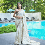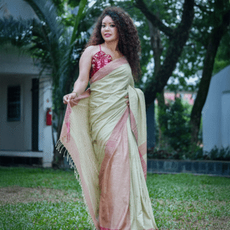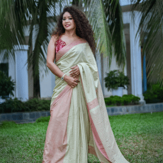 Drape yourself in the serene elegance of The Sunset Stripe Saree, a handwoven masterpiece from the skilled artisans of North East. Crafted from luxurious handloom silk, this saree offers an exquisite drape and a soft, comfortable feel. The pristine natural white body is adorned with a delicate plaid pattern, created by fine, woven stripes in a warm, muted red and a soft beige. This simple yet sophisticated design makes the saree a versatile and timeless addition to any wardrobe. It perfectly embodies the brand’s commitment to conscious luxury, blending traditional weaving techniques with a clean, contemporary aesthetic that defines Filbrelust.